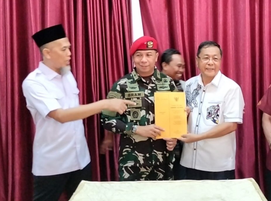 Dumai, RIAURILIS.COM - Bertempat di kediaman rumah dinas Walikota Dumai, Sabtu (22/11/2025) pagi dilakukan serah terima tanah hibah dari pemilik lahan Junaidi Zhang (Ayu) kepada Komandan Grup 3 Kopassus, Brigadir Jenderal TNI Bram Pramudia, SE.